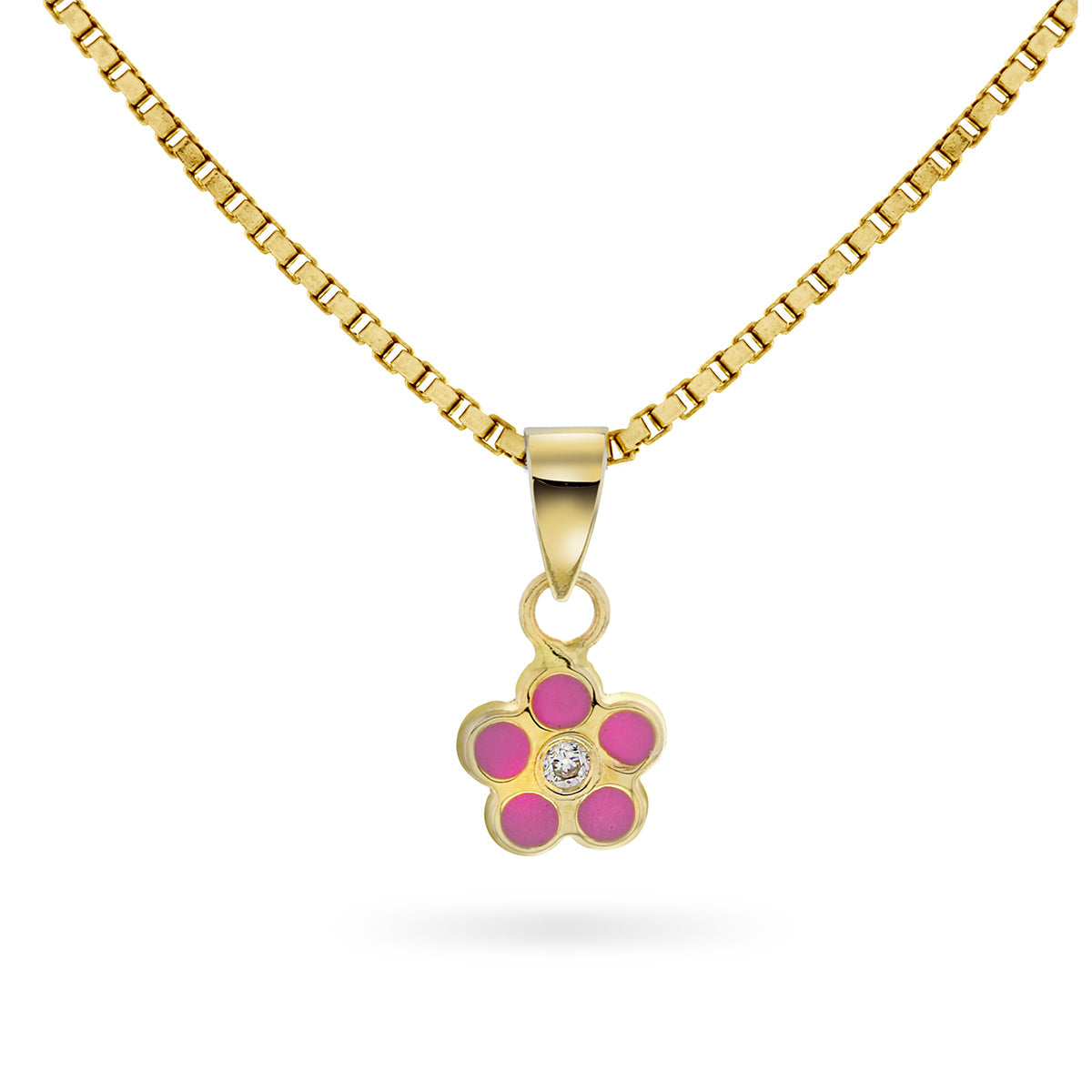 Flott 14k (585) anheng i gult gull og emalje, med blomstermotiv. Dette passer perfekt til barn, og som gave til dåp eller navnedag.