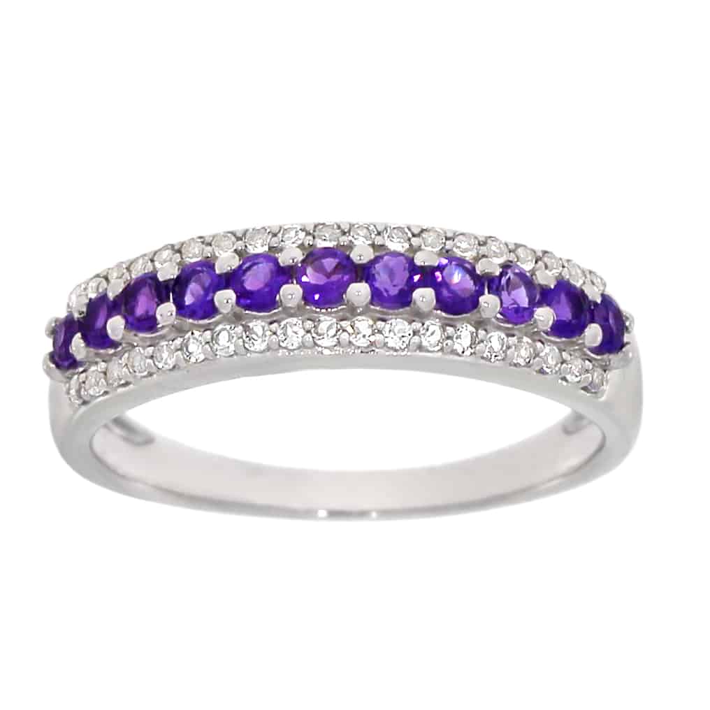 Dette er en flott og livlig ring, med Ametyster som glittrer lilla. Den har hvite topas steiner på sidene som omfavner ametysten og gir ringen et utrolig fint utseende. Dette er en ring en hver person hade satt pris på!