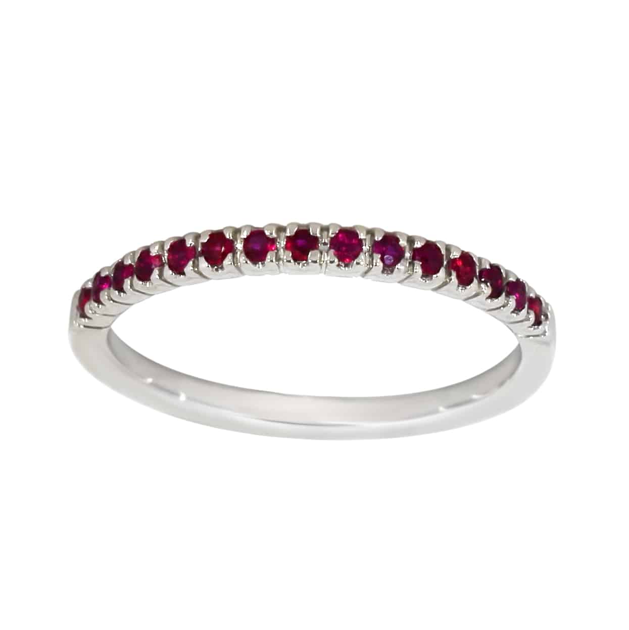 Denne nydelige diamantringern har en smal rekke med rubiner langs nesten halve ringen, de er fattet i solide klør som gjør dette til en flott hverdagsring. Den gjør seg godt alene, eller sammen med en giftering eller en annen diamantring. En av våre mest populære morgengaver.