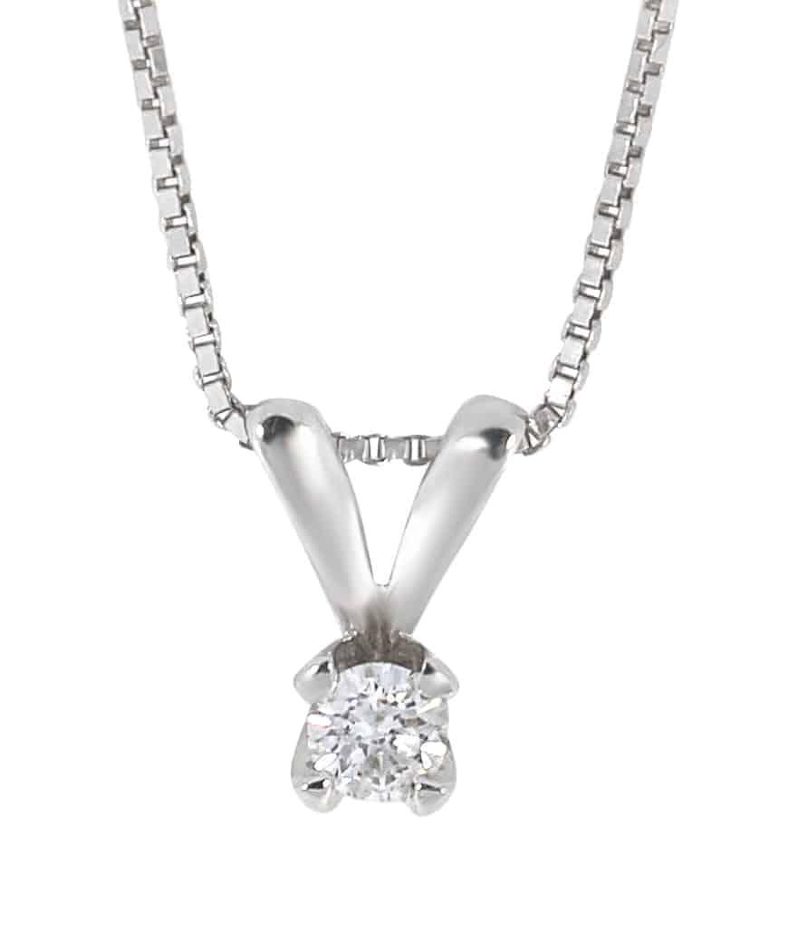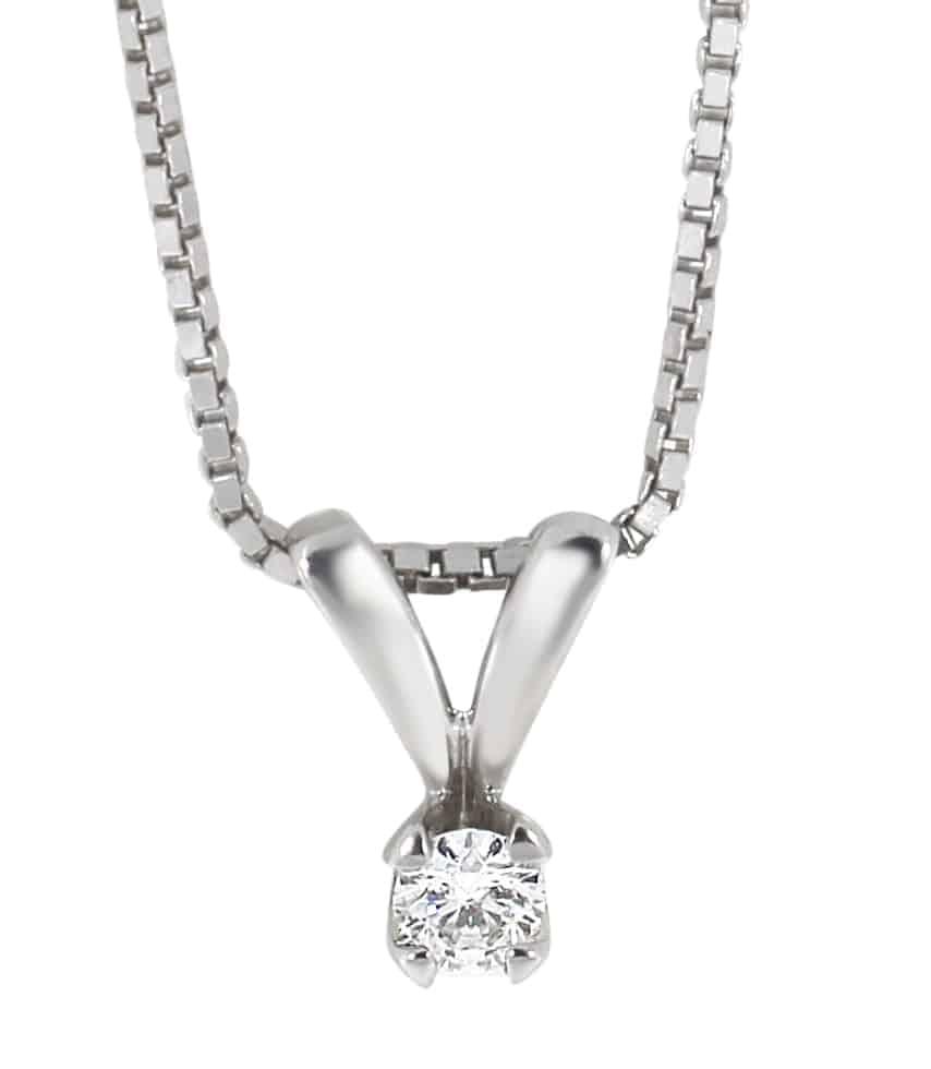 Enkelt og vakkert! Enstens diamanthalssmykke i 14kt hvitt gull (585) med én diamant. Adele er et vakkert og elegant enstens diamantanheng hvor diamantene er festet av fire klør som får diamanten til å stråle.