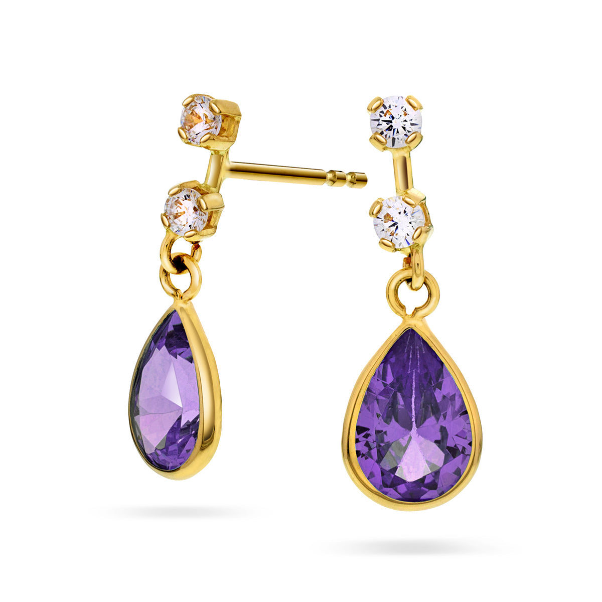 Vakre øredobber i 14k (585) gult gull med lilla og hvite zirkoner