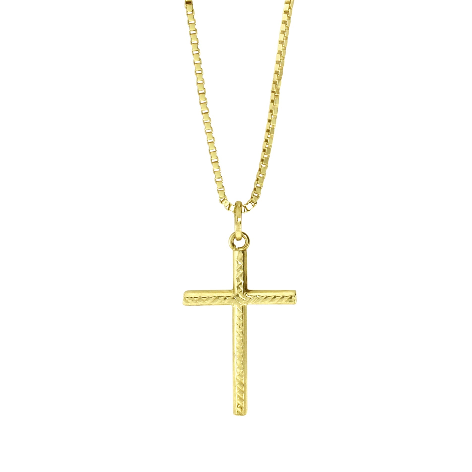 Klassisk korsanheng i 14 karat gult gull med dekorative slipte detaljer langs kantene. Den strukturerte overflaten gir smykket et tidløst uttrykk med ekstra dybde og glans.