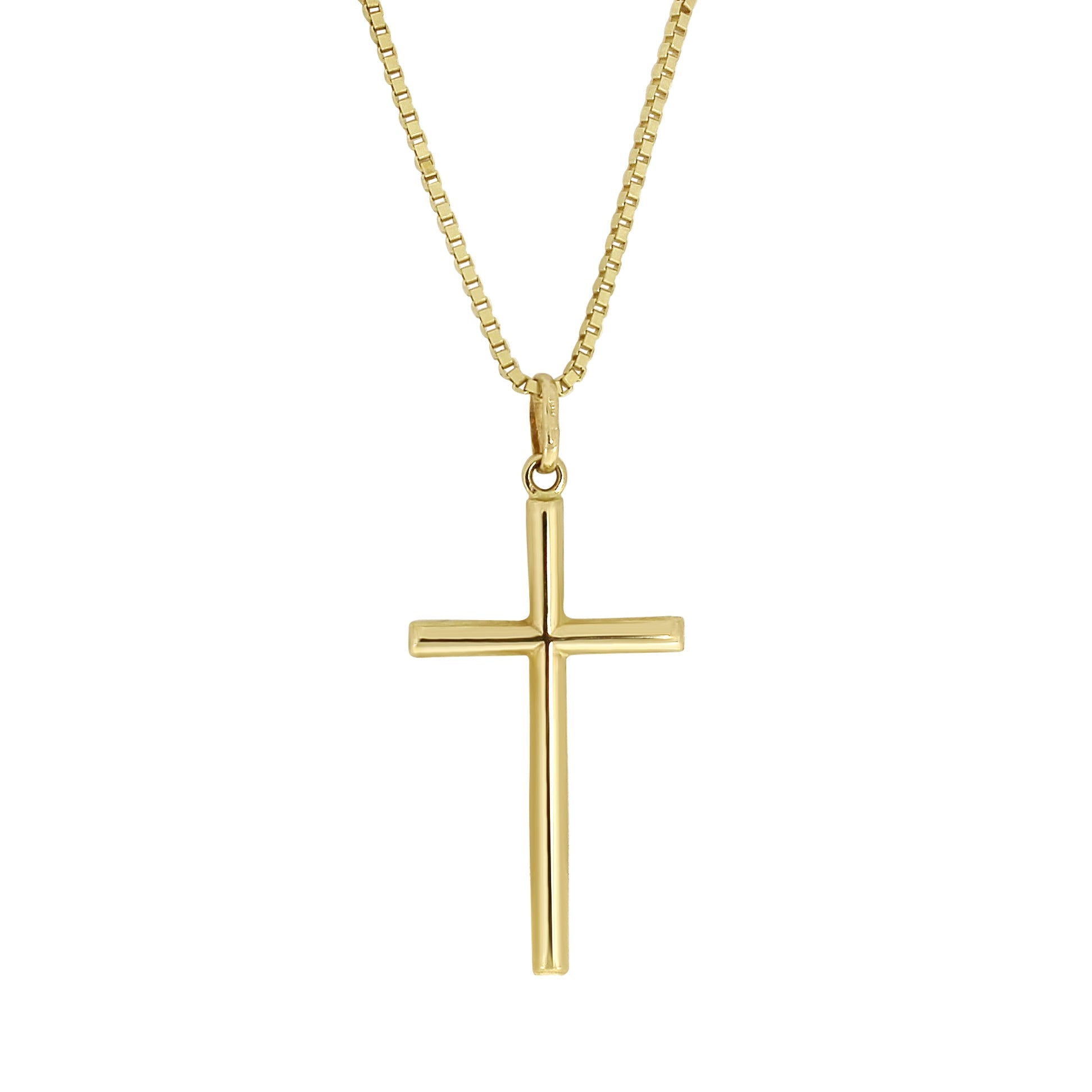Elegant korsanheng i 14 karat gult gull med blank overflate og klassisk form. Det slanke, stilrene designet gir et harmonisk uttrykk og fremhever det tidløse symbolet med diskret eleganse.