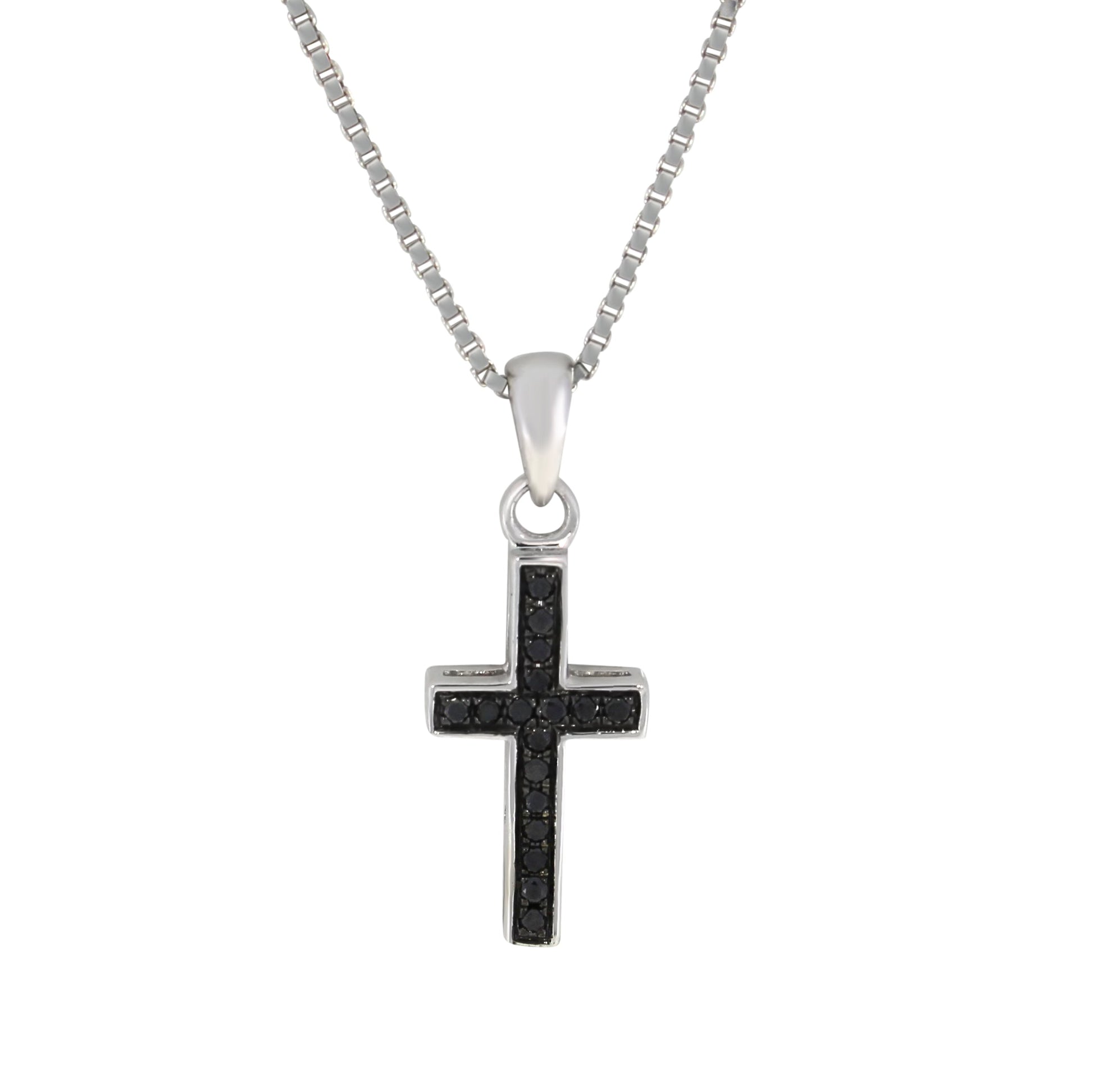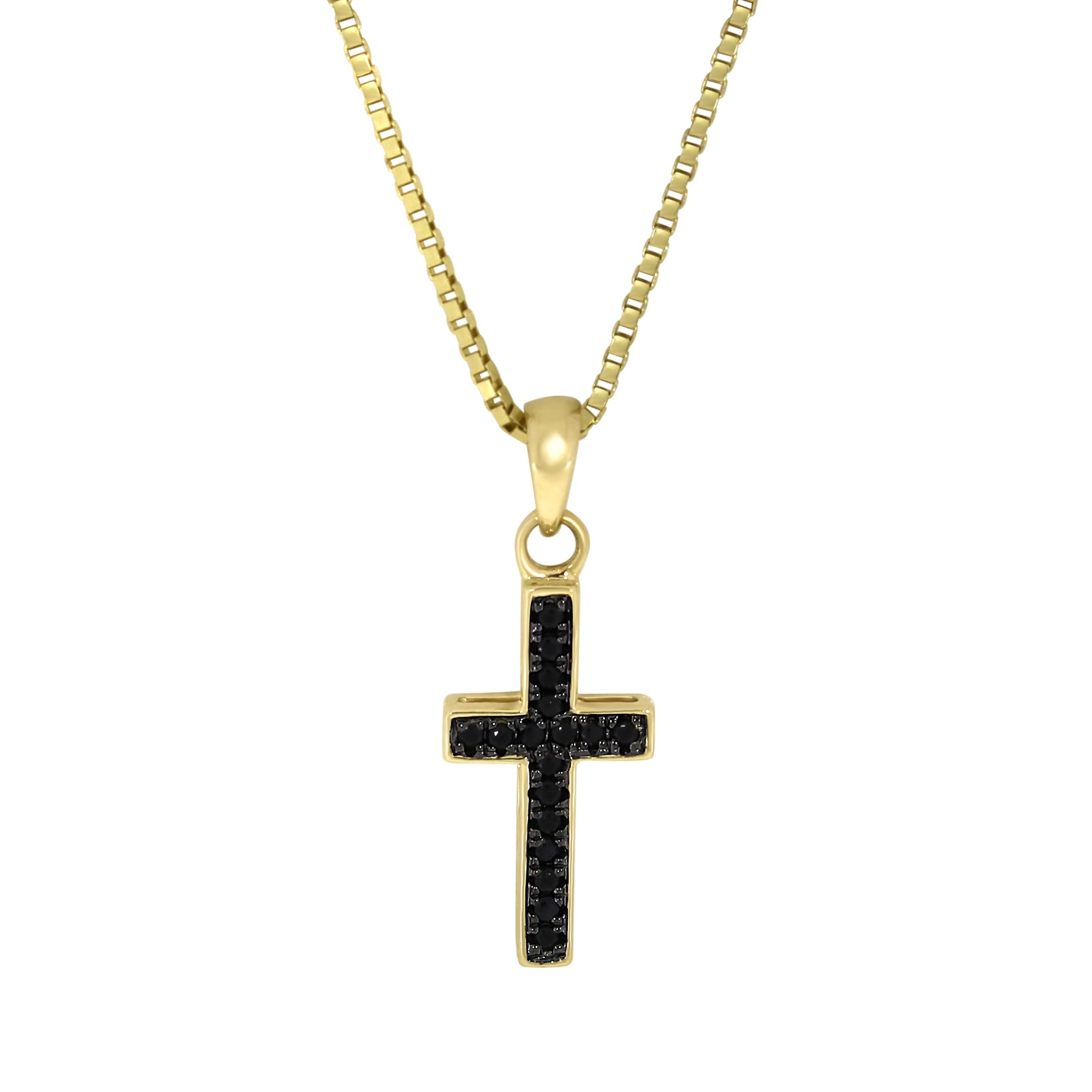 Elegant korsanheng i 14 karat gult eller hvitt gull med 0.15 ct svarte diamanter, tett innfattet i et presist og symmetrisk design. Den mørke glansen fra diamantene skaper et sofistikert og moderne uttrykk, fremhevet av kontrasten mot det blanke gullet. Formen gir smykket en tydelig og stilren silhuett.