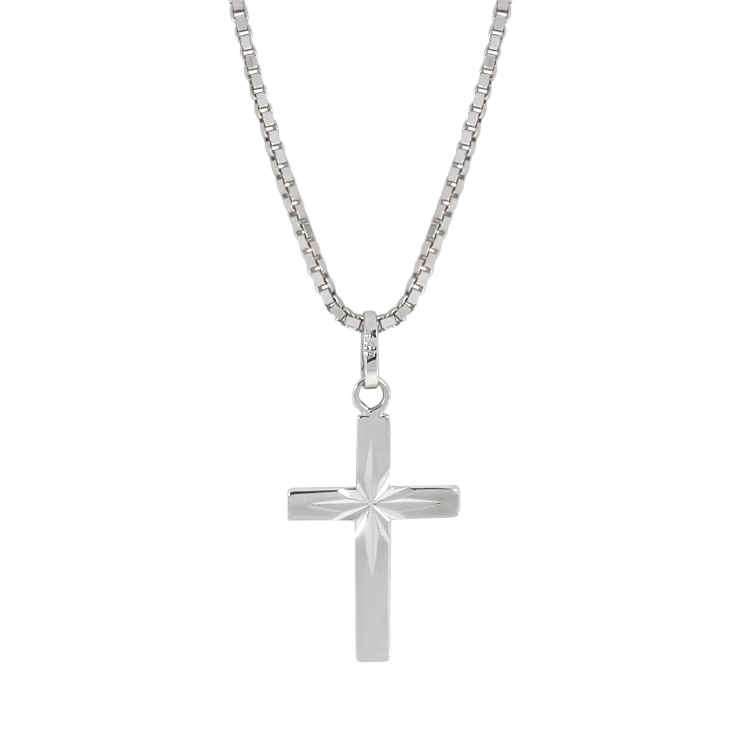 Elegant kors i 14 karat hvitt gull med en stjerneformet gravering som tilfører dybde og karakter. Den rene silhuetten og det blanke gullfinishen gjør smykket allsidig og klassisk.