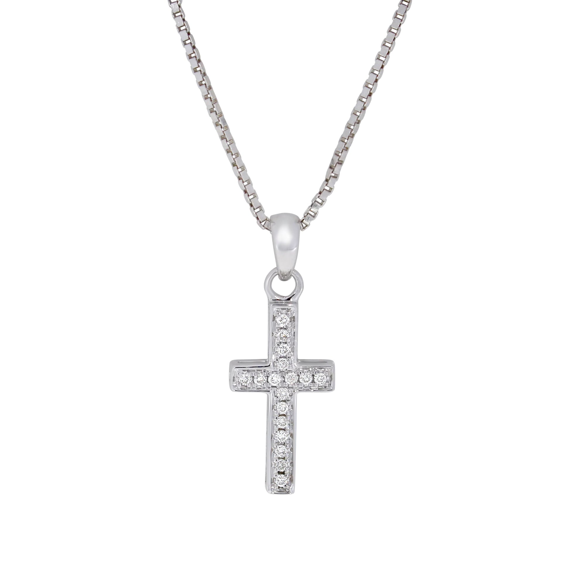 Elegant korsanheng i 14 karat hvitt gull med 0.15 ct TW/SI diamanter tett innfattet langs hele korsets overflate. Det stramme designet gir en balansert kombinasjon av glans og symbolikk, mens det blanke gullet gir en kjølig og moderne kontrast til diamantenes klare lys. Hver stein er presist plassert for maksimal visuell effekt.