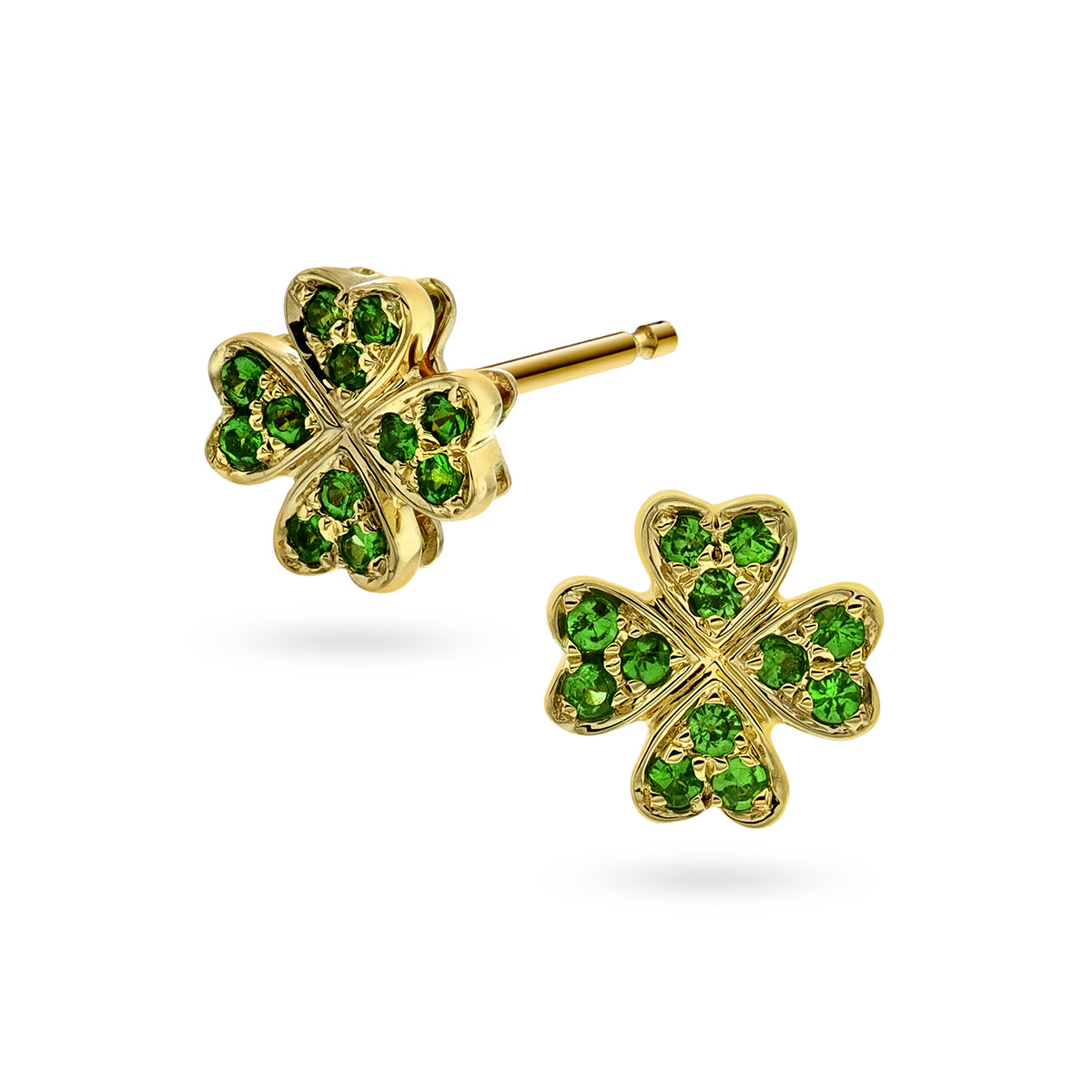 Sjarmerende øredobber i 14 karat gult gull formet som firkløvere, dekorert med grønne travositter på totalt 0.12 ct. De klare, intense grønntonene gir en leken og livlig kontrast mot det varme gullet, mens den fine slipen fremhever edelstenernes glans.