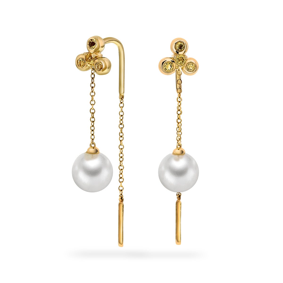 Strålende ørepynt i 14 karat gult gull med gyllengule citriner på 0.15 ct og hengende ferskvannsperle. De varme tonene i edelstenene fremhever gullens glød og skaper et lyst og friskt uttrykk. Den bevegelige lenken gir smykket en lett og livlig karakter. Kombinasjonen av farget sten og perle gir et spennende, men balansert design.