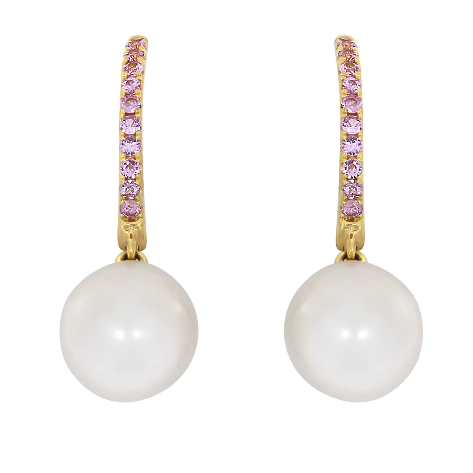 Eksklusiv ørepynt med 9.5 mm ferskvannsperler og hele 0.34 ct rosa safirer som gir en feminin og luksuriøs glød. Det varme gullet harmonerer med safirenes rosatoner og skaper et uttrykk som er både moderne og klassisk.