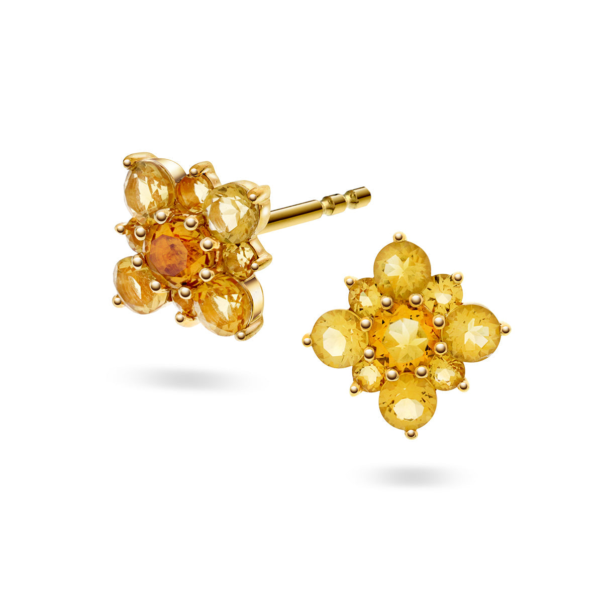 Strålende ørepynt i 14 karat gult gull med klare citriner som danner en elegant blomsterfasong. Den livlige gulfargen i steinene på totalt 1.00 ct gir et lyst og friskt preg som fanger lyset vakkert. Gullsmedarbeidet rammer inn hver sten med presisjon og balanse. Designet spiller på kontrasten mellom klassisk form og moderne fargespill.