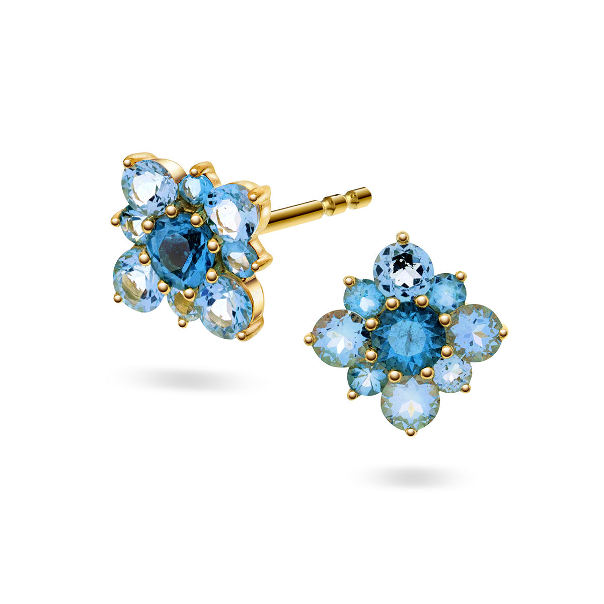 Klar og elegant ørepynt i 14 karat gult gull med naturlig topas i et raffinert blomstermønster. Med 1.00 ct edelsten får du et uttrykk som er både friskt og eksklusivt – hvor lysblå toner gir et subtilt fargespill mot det gyldne gullet. Hver sten er presist satt for optimal glans. Det klassiske uttrykket får et moderne løft gjennom fargevalget.