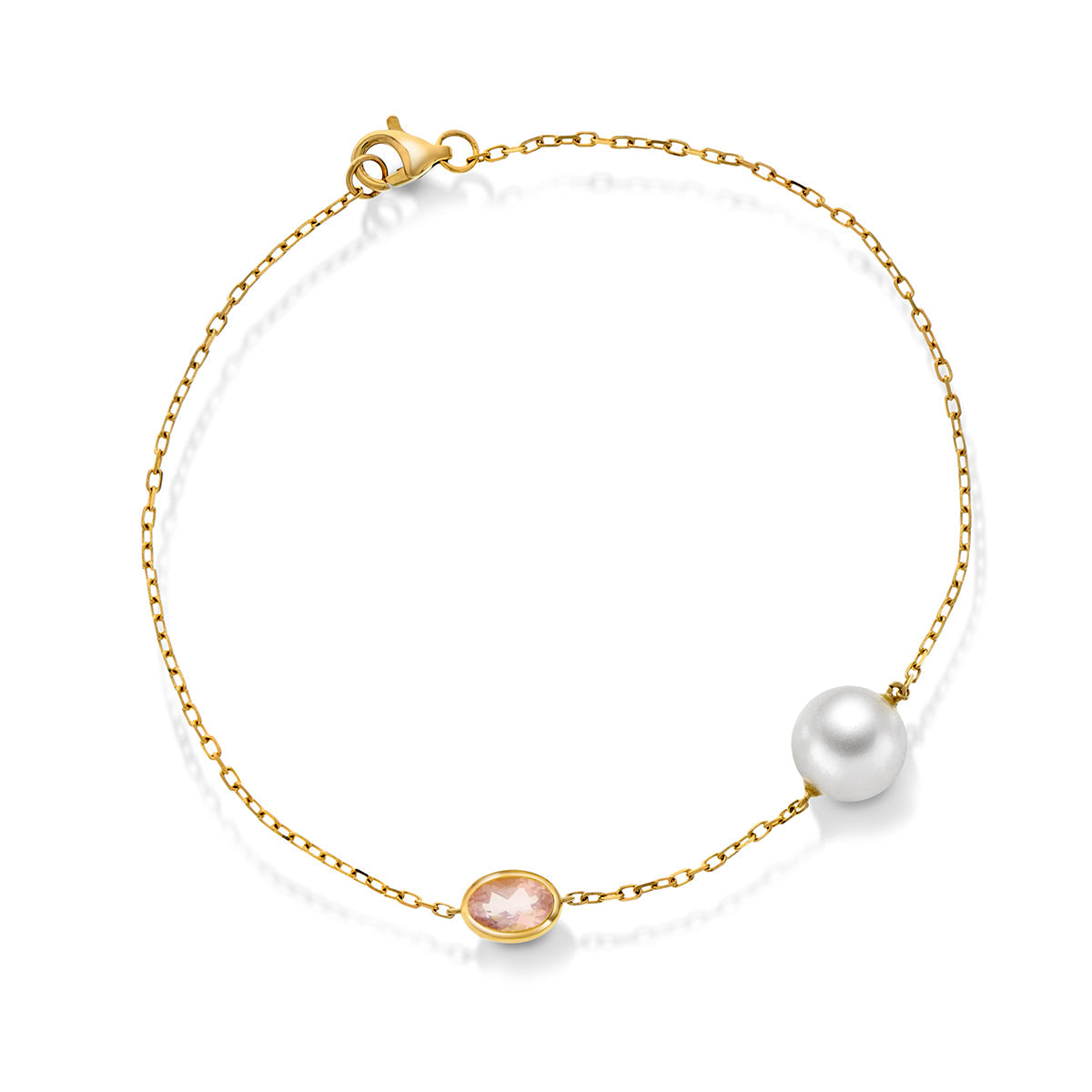 Delikat perlearmbånd i 14 karat gult gull med 0.55 ct rosekvarts og en 8 mm ferskvannsperle. Den lyse rosa edelstenen gir et mykt og harmonisk inntrykk, mens perlen tilfører klassisk glans og tekstur. Samspillet mellom gull, sten og perle skaper en gjennomført og balansert design.