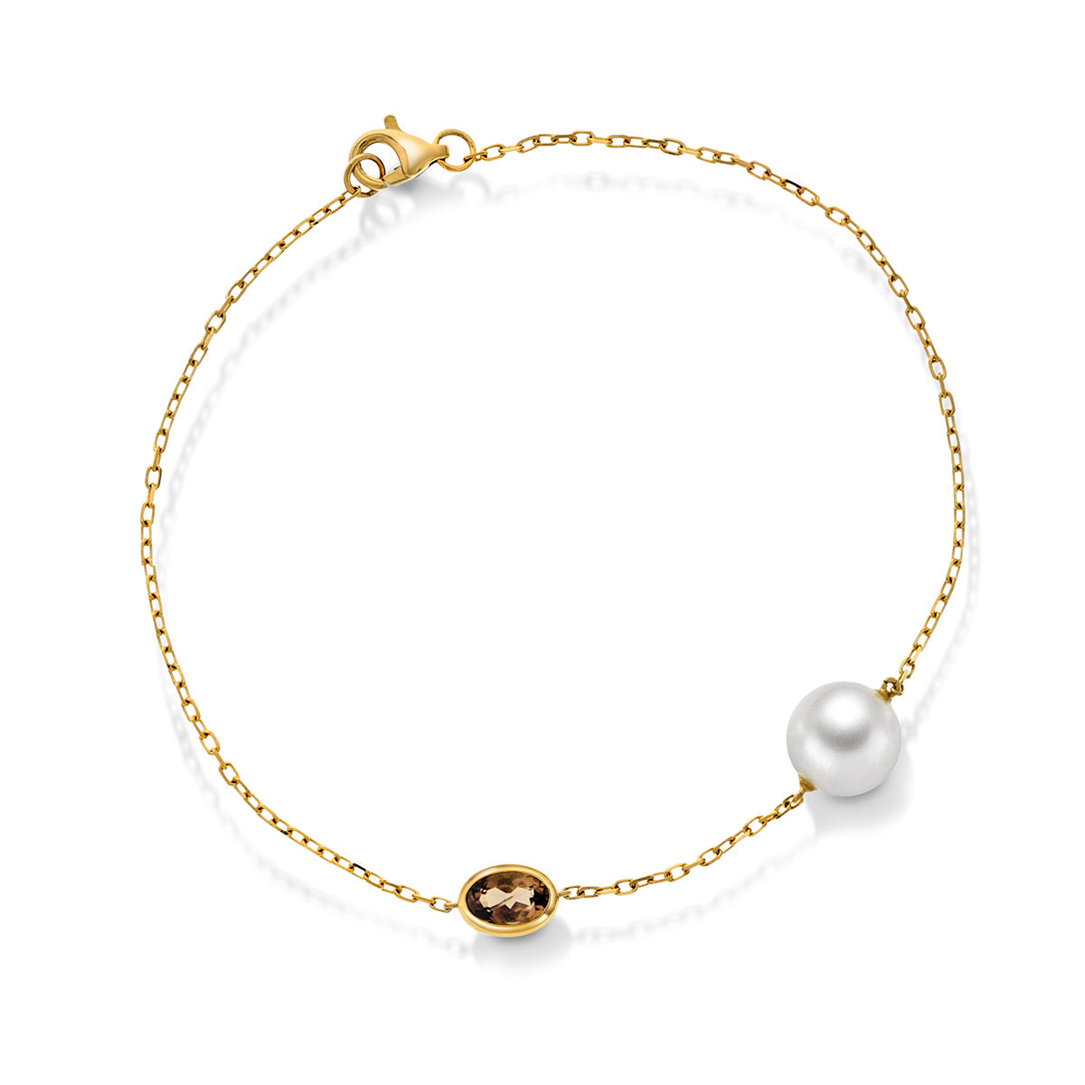 Tidløst armbånd i 14 karat gult gull med en røykfarget kvarts på 0.55 ct og en 8 mm rund ferskvannsperle. Edelstenens jordnære farge gir smykket dybde, mens perlen tilfører et elegant løft. Den lette kjedekonstruksjonen sørger for et luftig og sofistikert uttrykk.