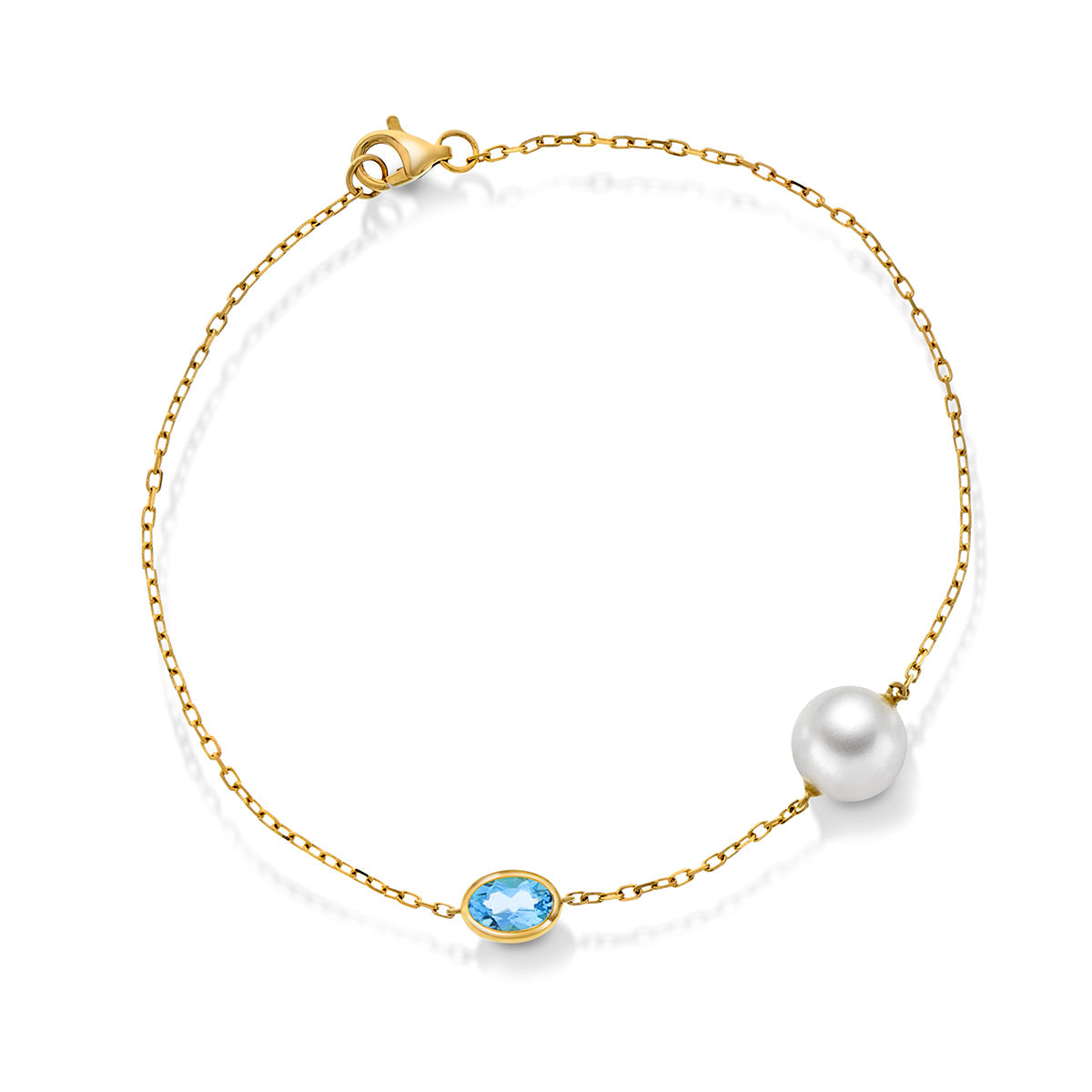 Glitrende armbånd i 14 karat gult gull med 0.55 ct blå topas og en 8 mm ferskvannsperle. Den lyseblå stenen gir en frisk kontrast til den varme gulltonen, mens perlen tilfører et tidløst og elegant uttrykk. Designet fremstår både lett og luksuriøst.