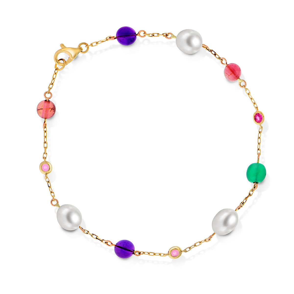 Fargerikt perlearmbånd i 14 karat gult gull med glatte edelstener og delikate ferskvannsperler i skjønn forening. Armbåndet kombinerer sterke og myke toner i en elegant balanse, med hver sten satt i en raffinert lenke som gir smykket liv og bevegelse.