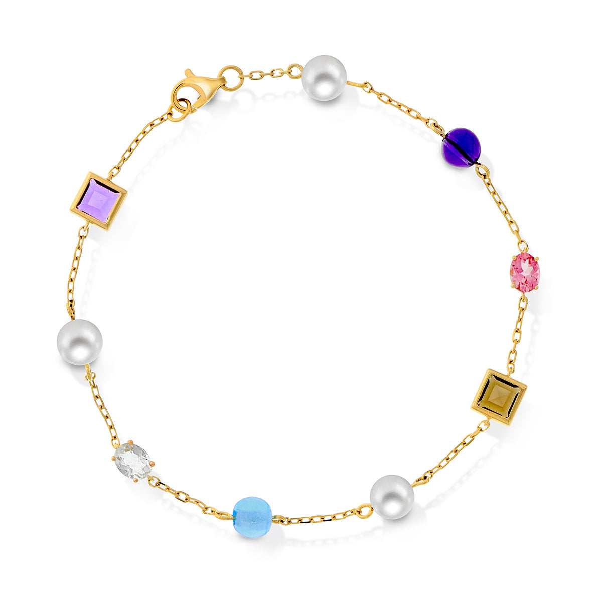 Perlearmbånd i Gult Gull(585) med Flerfargede Edelstener og Ferskvannsperler