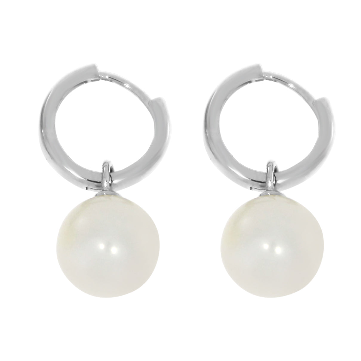 Elegant perleørepynt med 8.5–9 mm ferskvannsperler hengende fra glatte creoler i hvitt gull. Den rene og avrundede formen på bøylen gir smykket en moderne og balansert silhuett, mens perlene tilfører en klassisk og tidløs dybde. Ørepynten passer både til daglig bruk og til spesielle anledninger.
