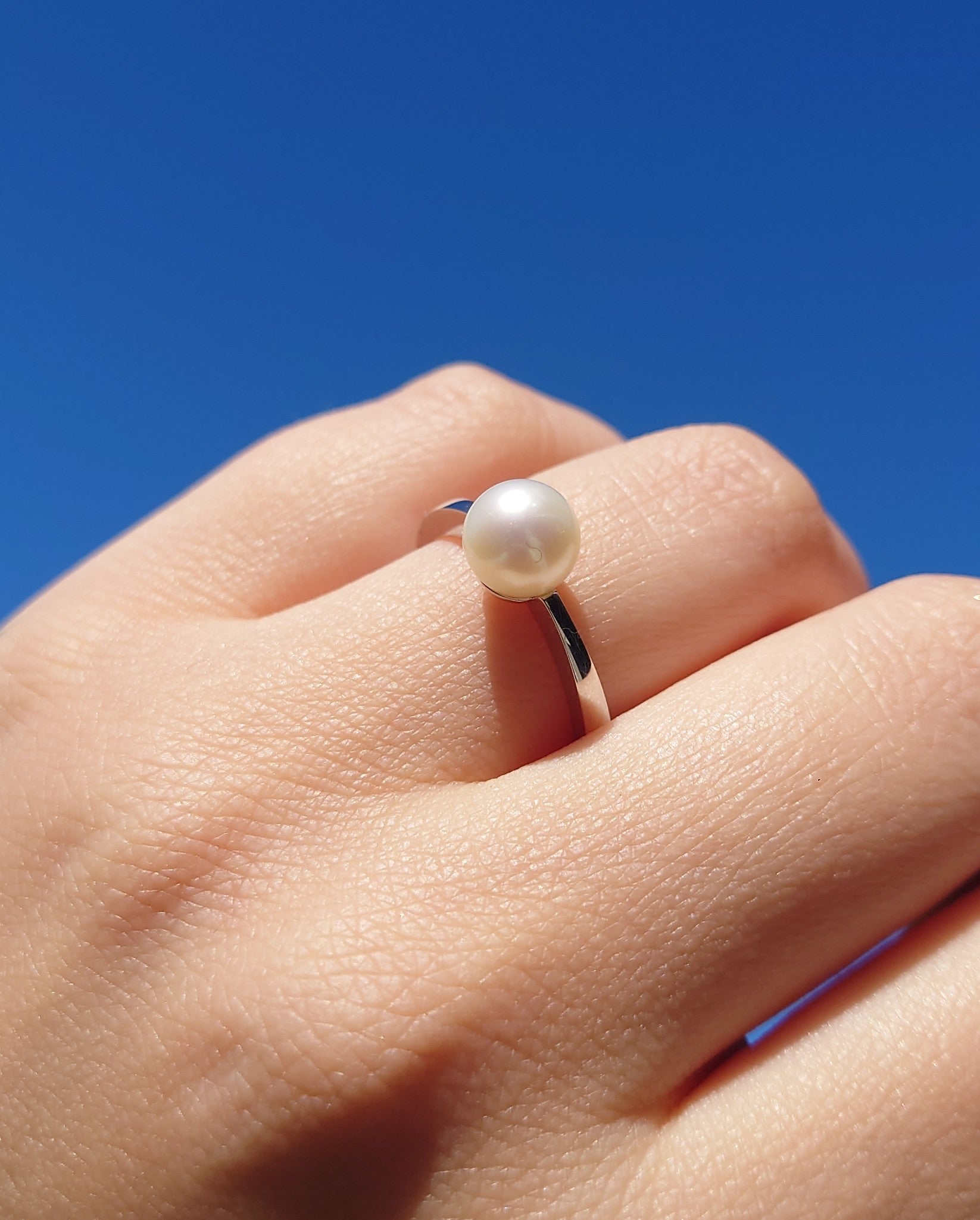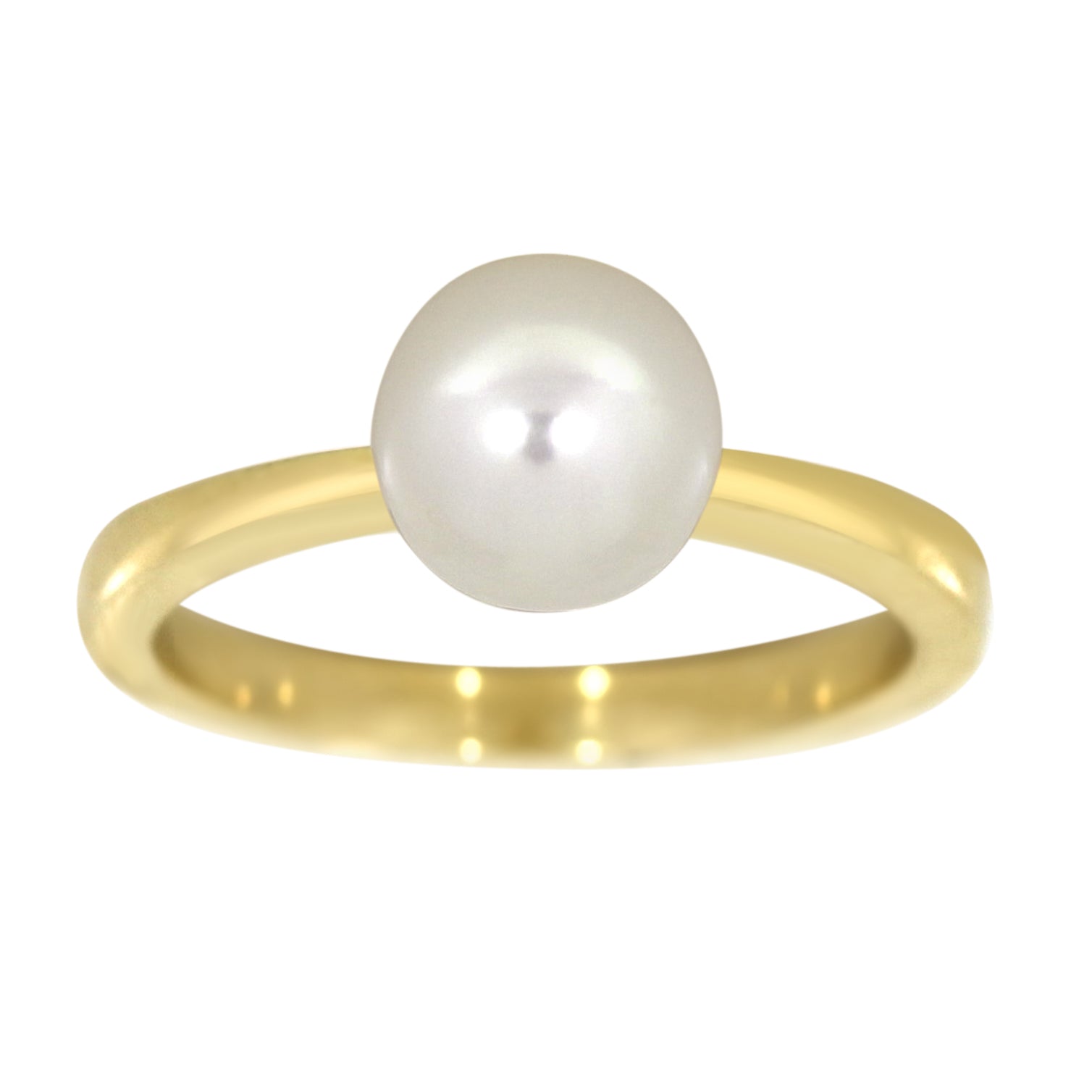 Elegant perlering i 14 karat hvitt eller gult gull med en rund ferskvannsperle på 7.5–8 mm som hviler i et rent og balansert design. Den silkemyke overflaten på perlen fremheves av det blanke gullet og gir ringen et tidløst uttrykk med naturlig glød. Formen er klassisk, men allsidig nok til å bæres hver dag.