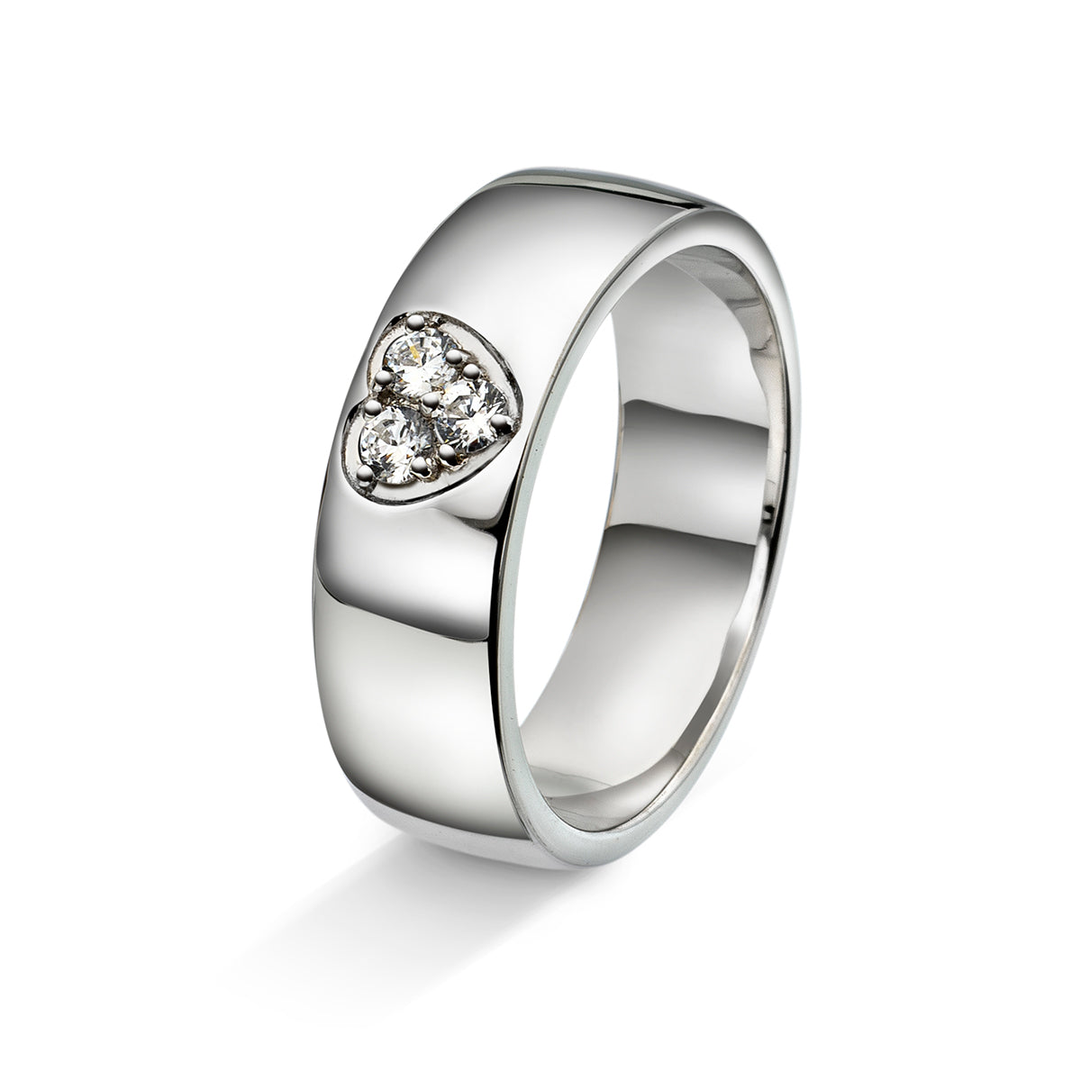 Giftering i 14 karat gult eller hvitt gull med et vakkert hjerte dekorert med tre glitrende diamanter på totalt 0.15ct. Et elegant og personlig valg som passer perfekt som symbol på kjærlighet og livslang forpliktelse. Vi tilbyr gratis gravering etter ønske.