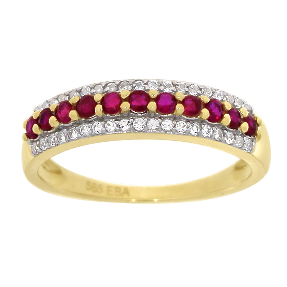 Strålende ring i hvitt eller gult gull, utsmykket med glitrende hvit topas og dype rubiner. Den klassiske kombinasjonen av klare og røde nyanser skaper et levende og elegant uttrykk. Perfekt for deg som ønsker et smykke med både karakter og tidløs skjønnhet. En nydelig gaveidé eller et smykke du vil glede deg over i mange år.