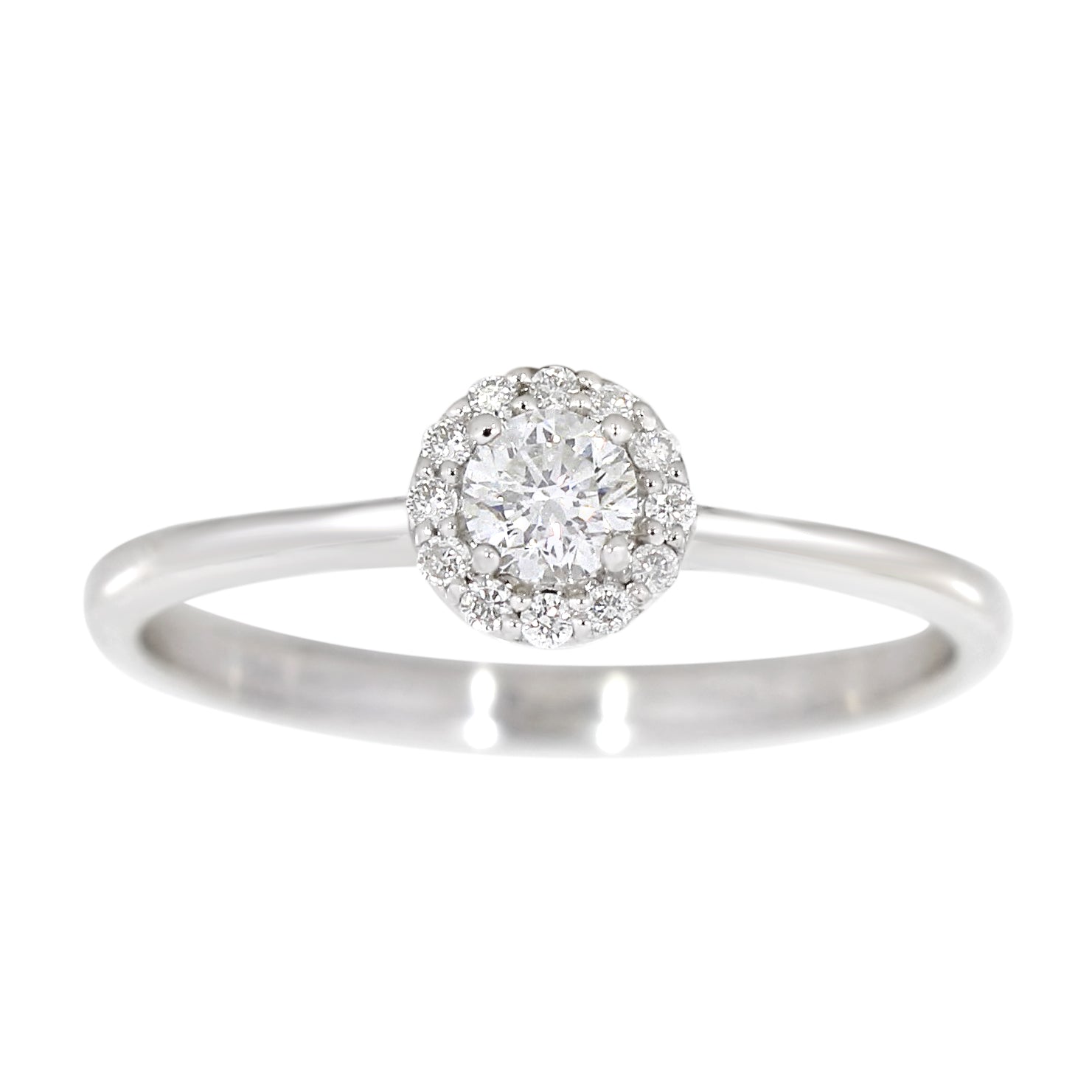 Sofistikert diamantring i 14 karat hvitt gull med et delikat midtparti på totalt 0.25 ct. Den sentrale diamanten omkranses av en glitrende halo av små brillanter som fremhever lysrefleksene og gir ringen et ekstra løft.