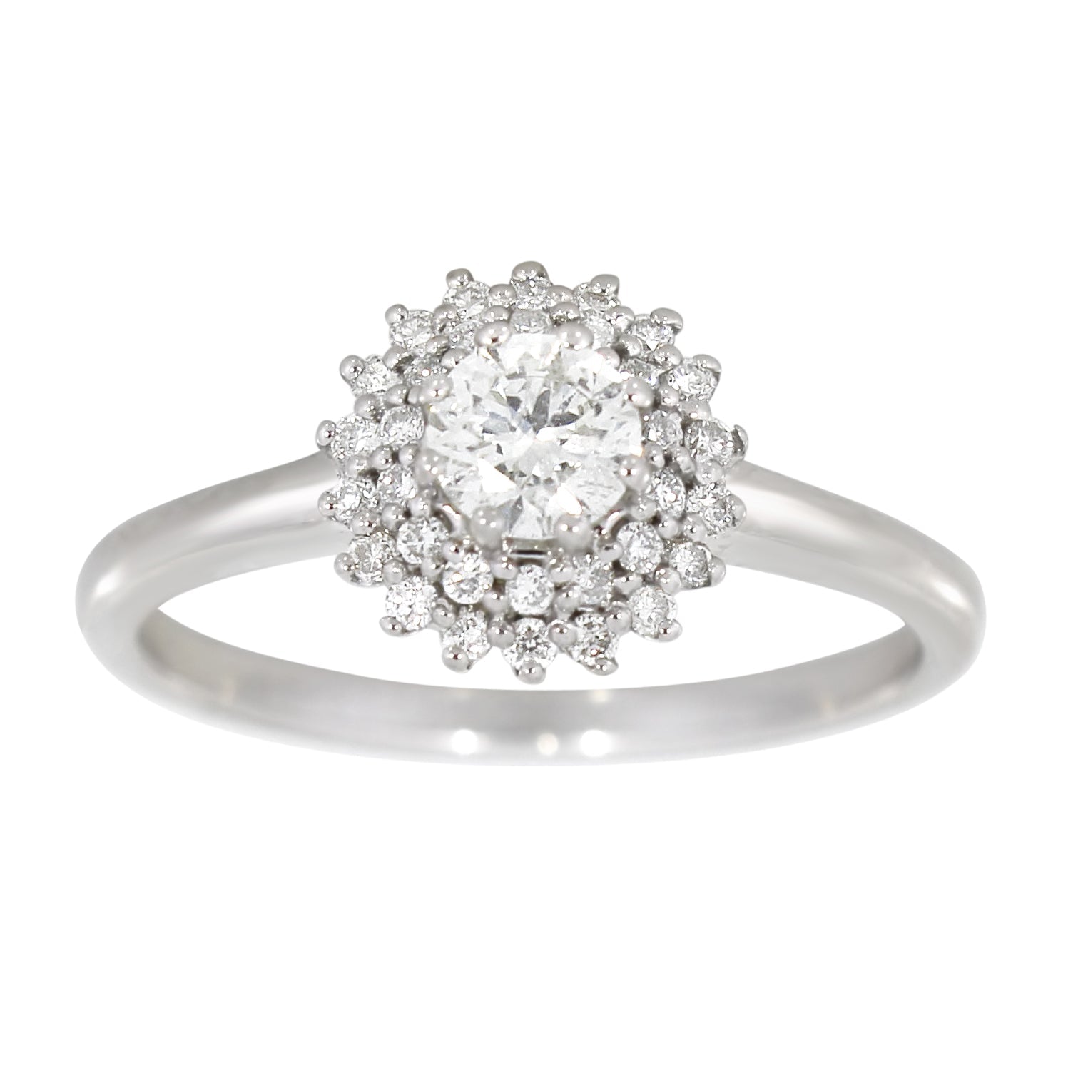 Strålende diamantring i 14 karat hvitt gull med en imponerende midtsten på 0.30 ct omgitt av en dobbel glitrende krans. Totalt 0.55 ct briljantslipte diamanter skaper et rikt og elegant uttrykk som virkelig fanger lyset.
