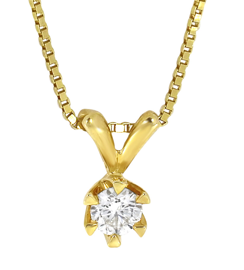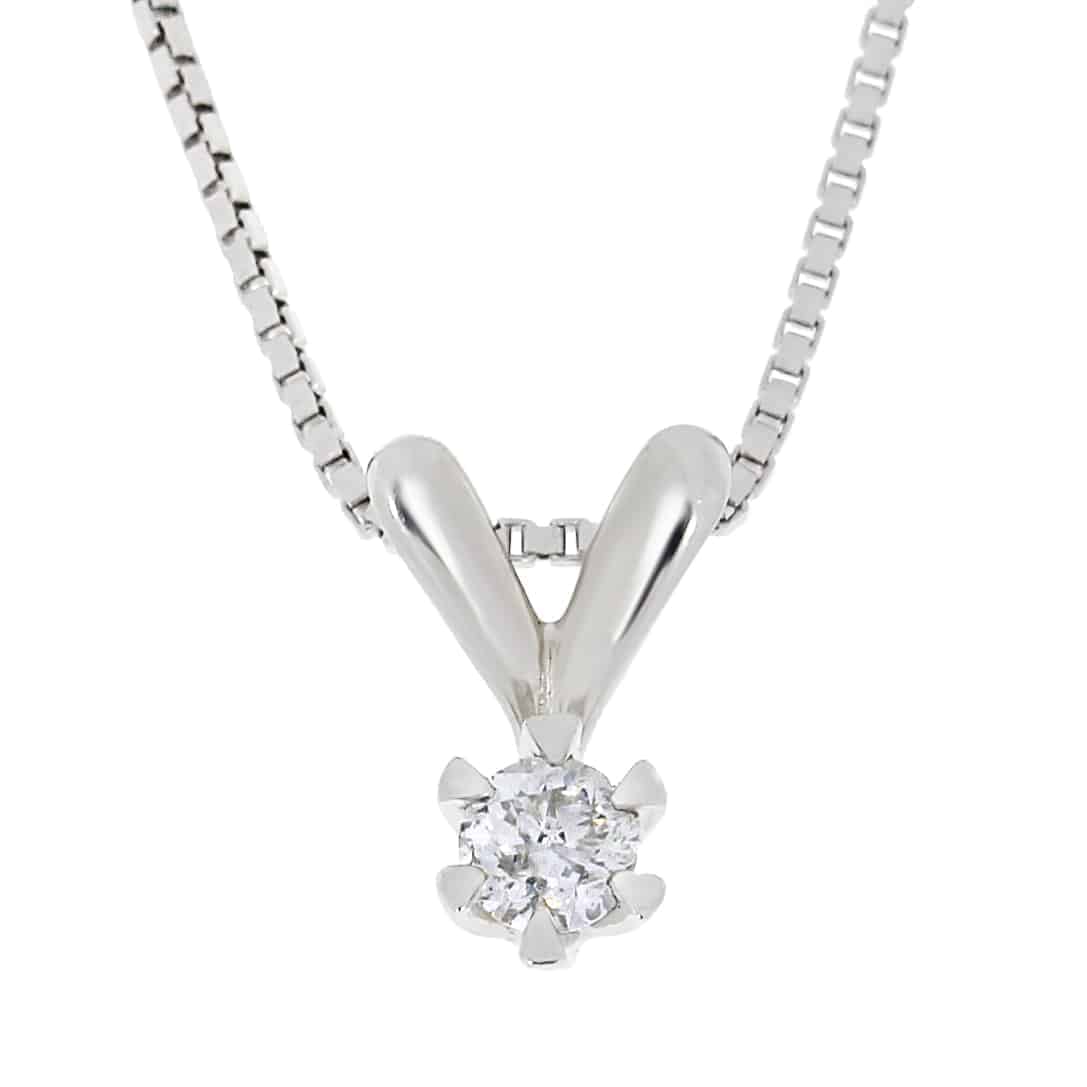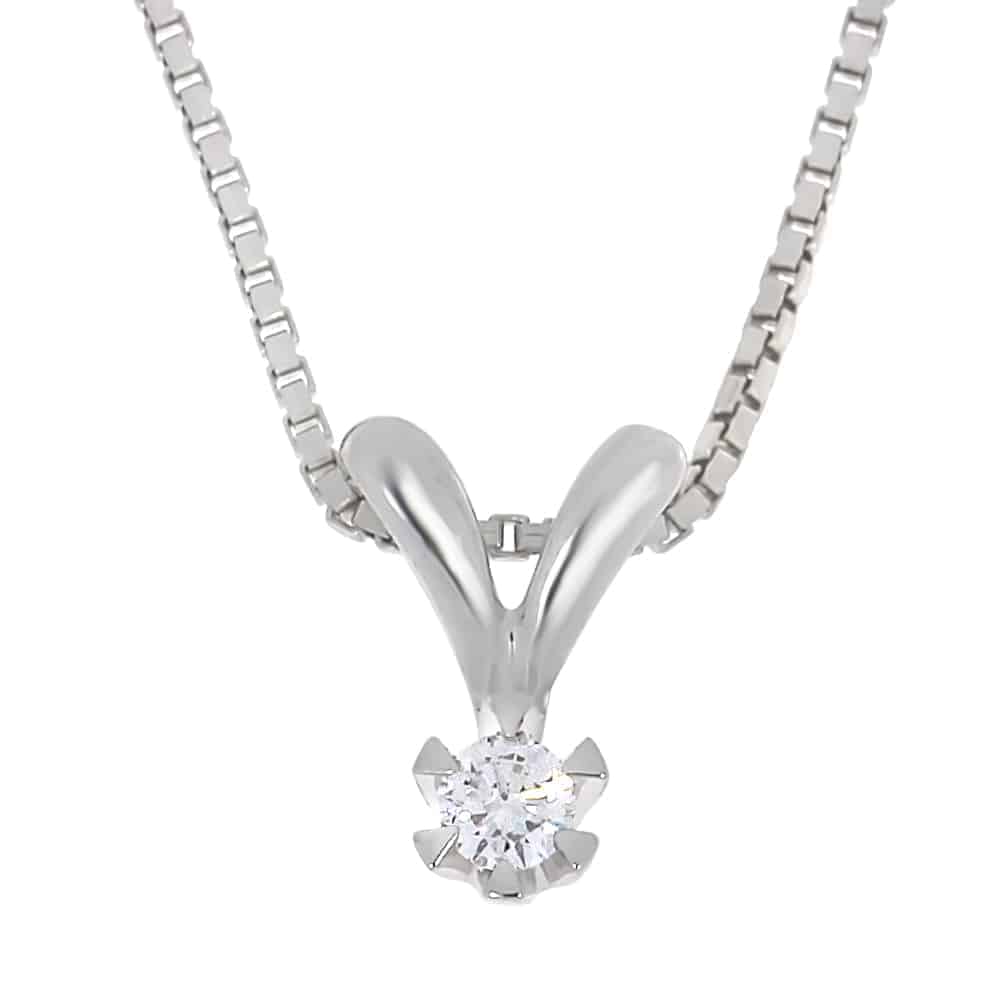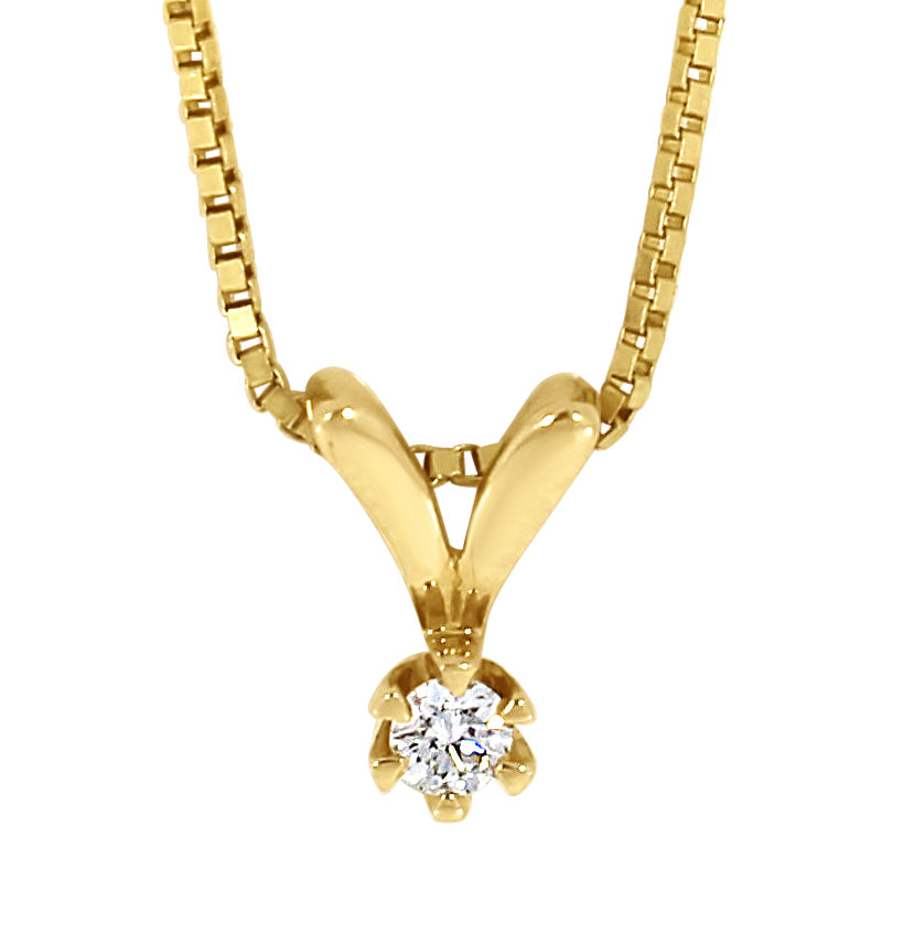 Elegant anheng i 14 karat gull med en glitrende diamant som fanges opp av en stilren V-formet fatning. Velg mellom hvitt eller gult gull for å tilpasse smykket til din personlige stil. Diamanten gir et vakkert fokuspunkt som fremhever halsen med subtil eleganse. Et tidløst smykke som passer like godt til hverdagsbruk som til spesielle anledninger.